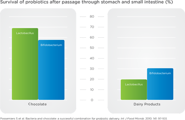 Čokoláda ako médium prispieva k lepšiemu prežívaniu probiotických baktérií v agresívnych podmienkach žalúdka a tenkého čreva v porovnaní s inými zdrojmi.